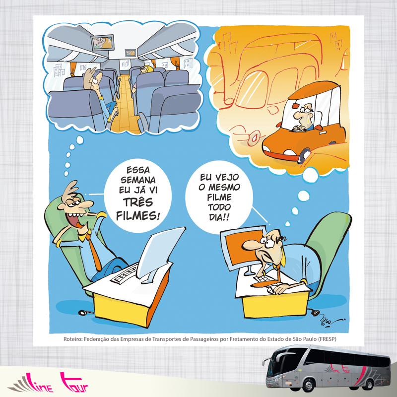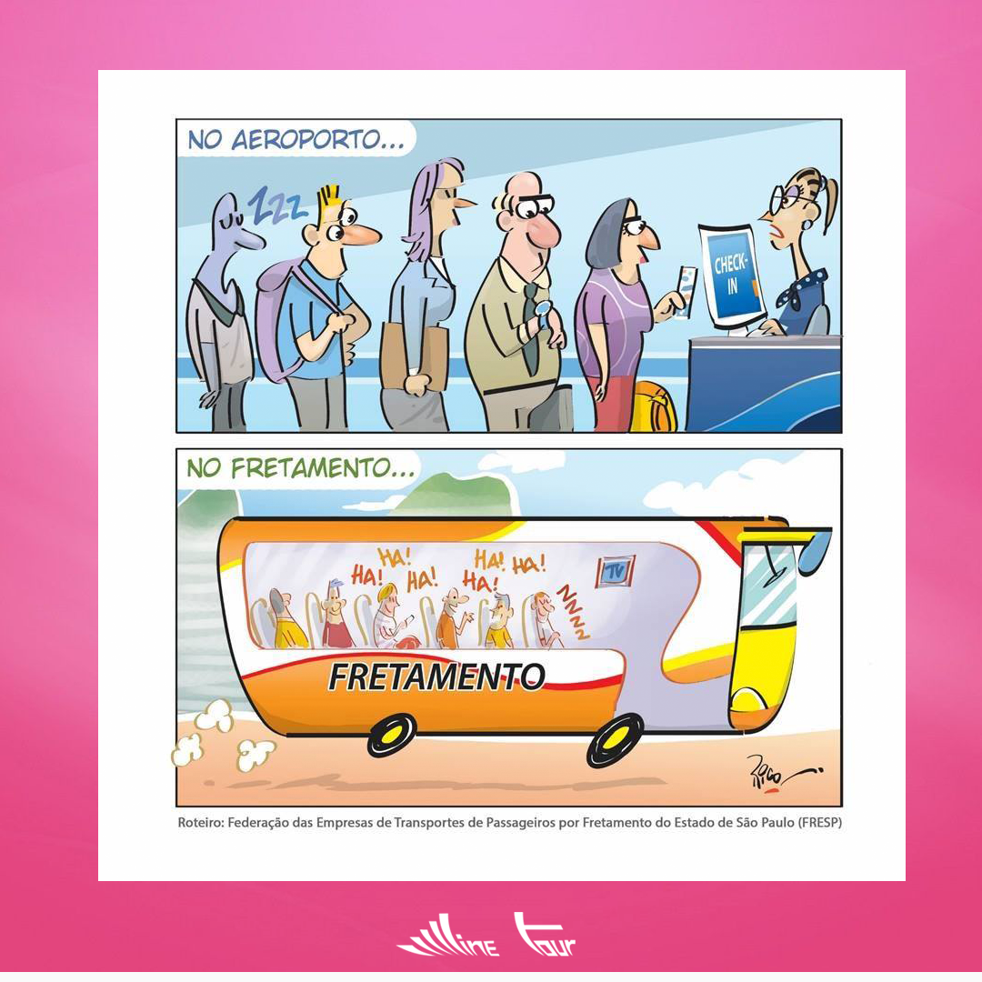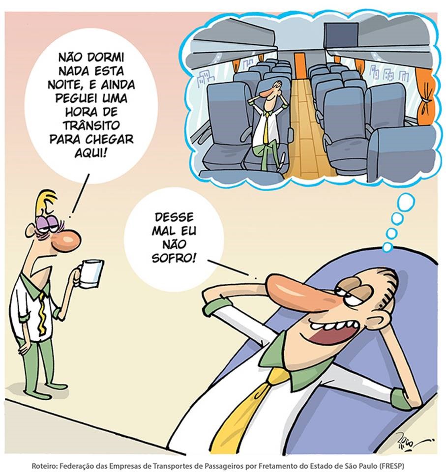 A FRESP deu início a uma ação institucional do fretamento, que apresenta os benefícios do modal com muito bom humor. As charges retratam o cotidiano dos passageiros, tanto no fretamento contínuo quanto no turismo.